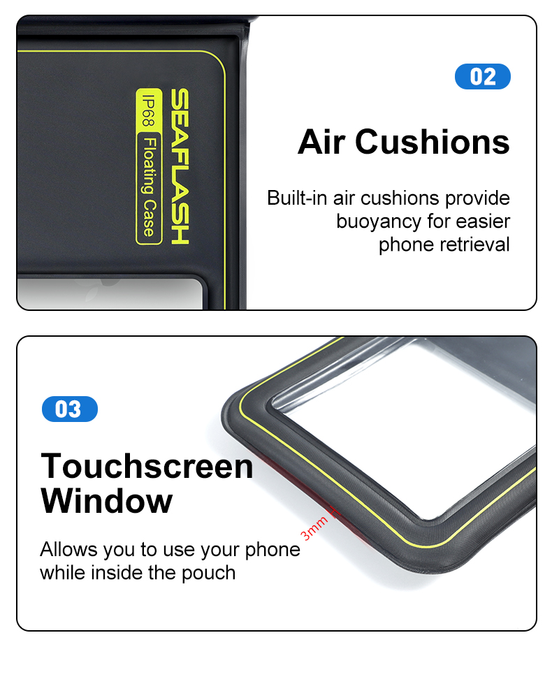 | Toiminto | vedenpitävä laukku uimiseen, rantalaukut puhelimiin, vedenpitävä laukku kalastukseen, pölynkestävä, lumenpitävä pussi matkapuhelimelle, vedenpitävä laukku vesipuistotoimintaan |