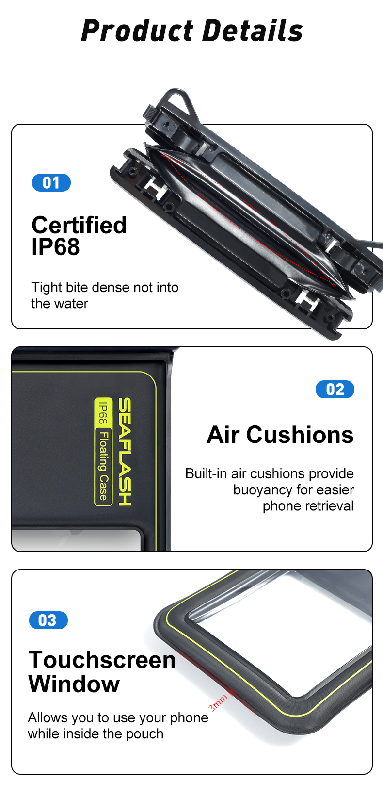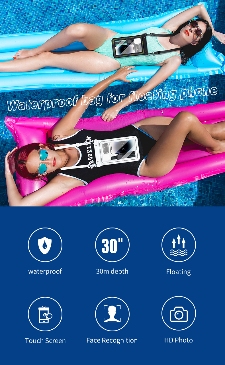 | Toiminto | vedenpitävä laukku uimiseen, rantalaukut puhelimiin, vedenpitävä laukku kalastukseen, pölynkestävä, lumenpitävä pussi matkapuhelimelle, vedenpitävä laukku vesipuistotoimintaan |