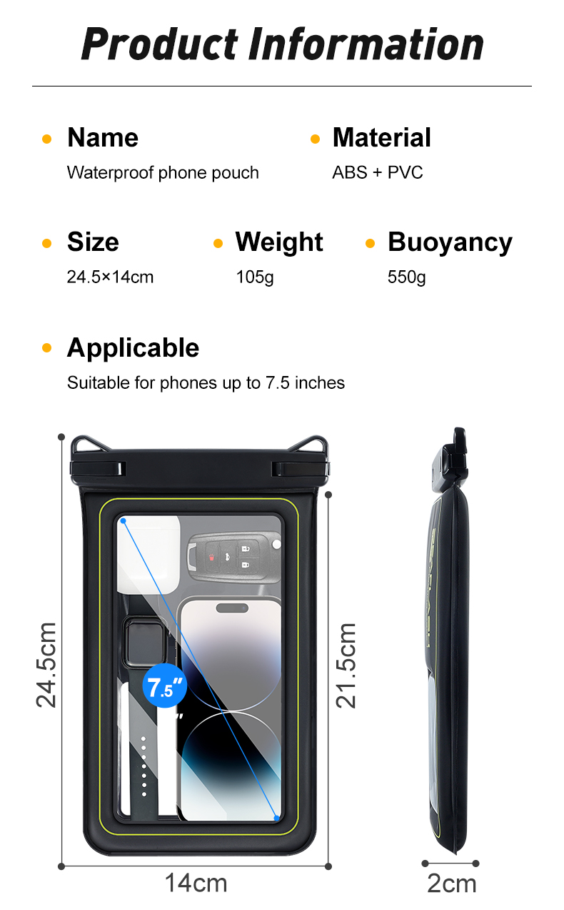 6. Ympäristöystävällinen PVC-materiaali saa sinut käyttämään 8,5 tuuman vedenpitävää puhelintaskua herkempiä.