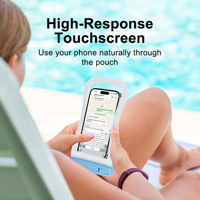 Pussin ei pitäisi haitata puhelimesi käytettävyyttä. Nopeasti reagoiva kosketusnäyttötekniikka mahdollistaa puhelimen luonnollisen käytön pussin läpi. Voit pyyhkäistä, kirjoittaa, vierittää ja napauttaa tarkasti, aivan kuten ilman esteitä. Tämä on elintärkeää musiikin vaihtamiseen, puheluihin vastaamiseen, sovellusten käyttöön tai kameran asetusten säätämiseen liikkeellä ollessasi.