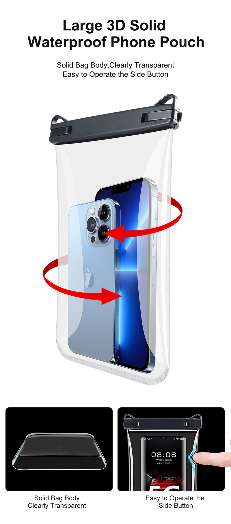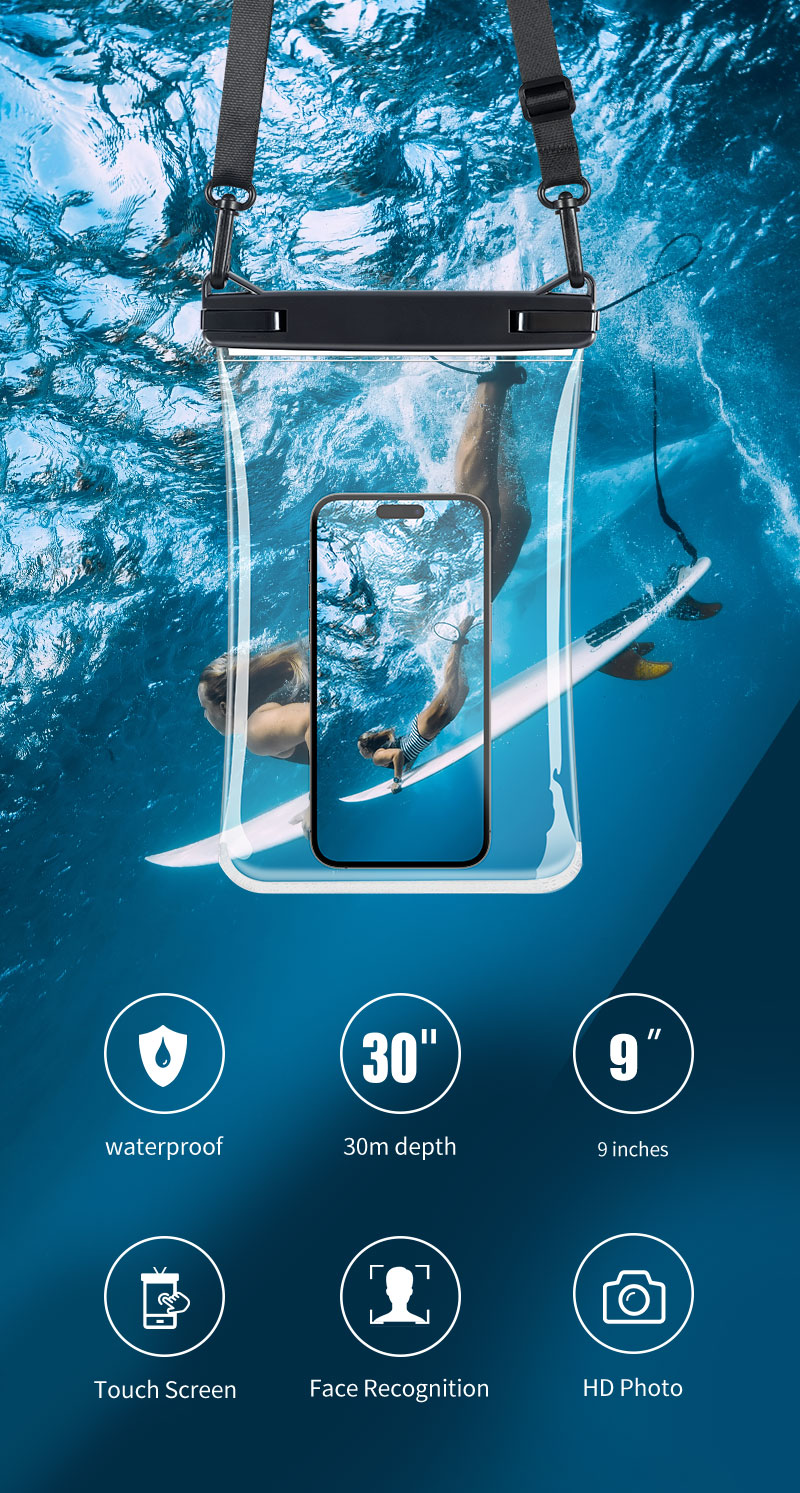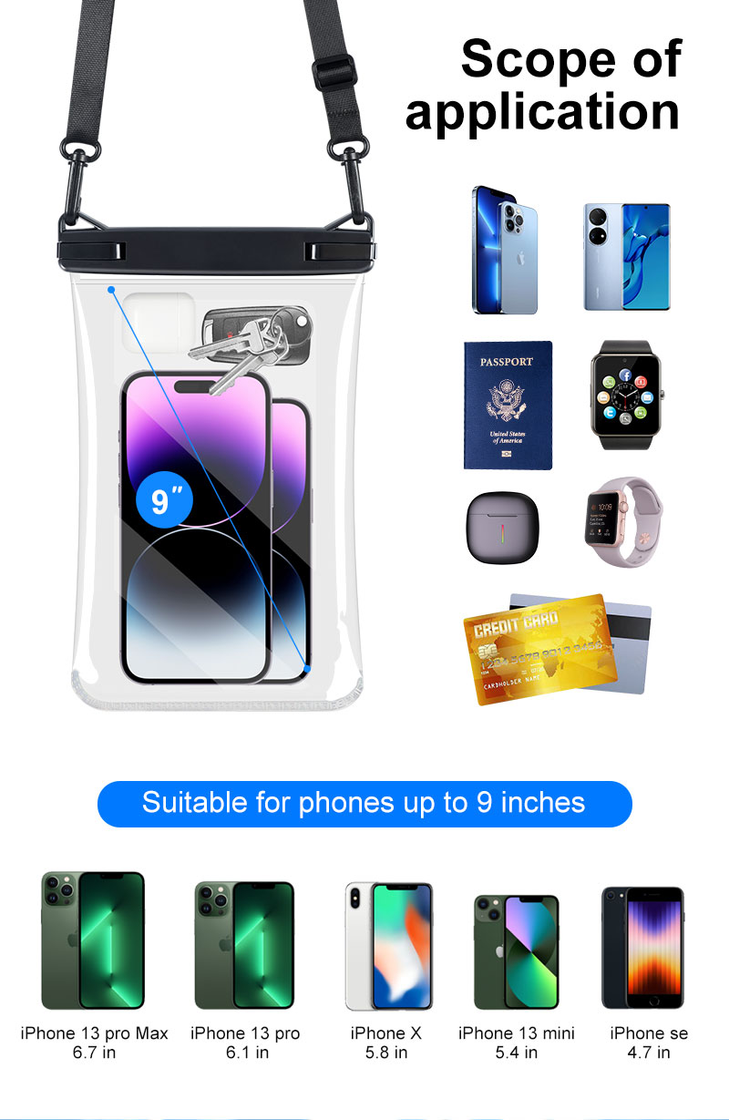 | Fonction | sac étanche pour la natation, sacs de plage pour téléphones, sac étanche pour la pêche, anti-poussière, pochette anti-neige pour téléphone portable, sac étanche pour les activités du parc aquatique |