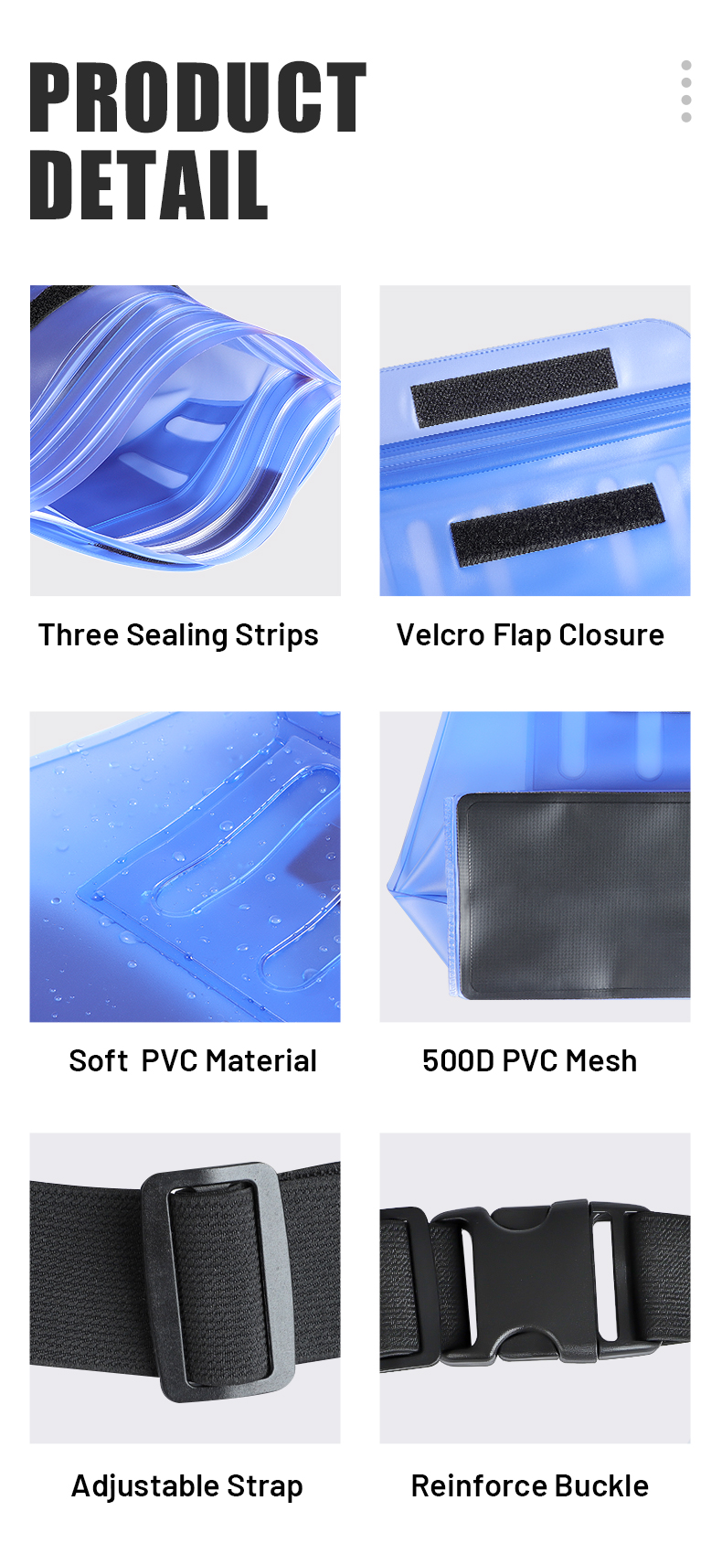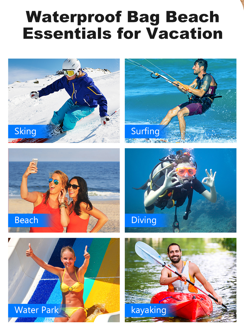 | Fonction | sac étanche pour la natation, sacs de plage pour téléphones, sac étanche pour la pêche, anti-poussière, pochette anti-neige pour téléphone portable, sac étanche pour les activités du parc aquatique |