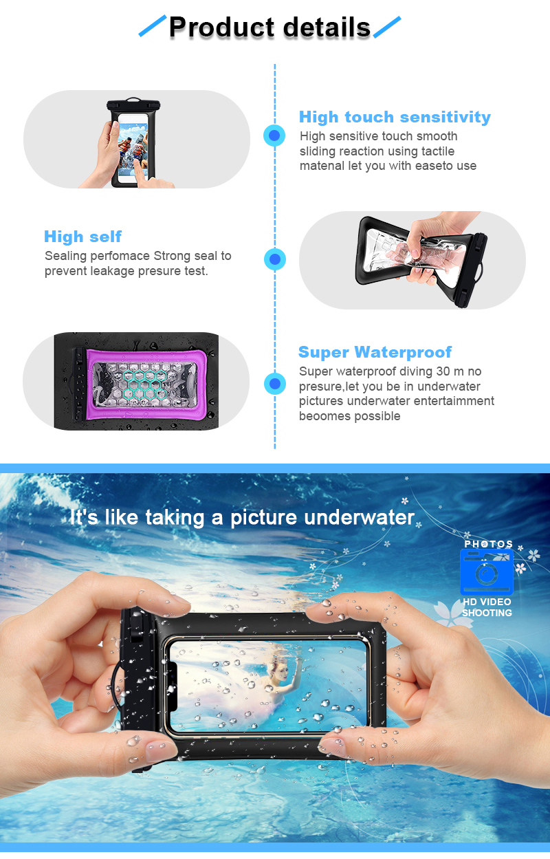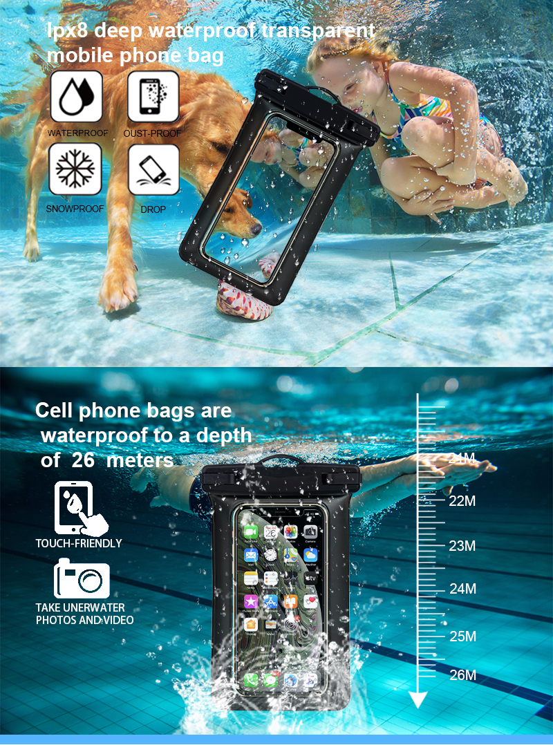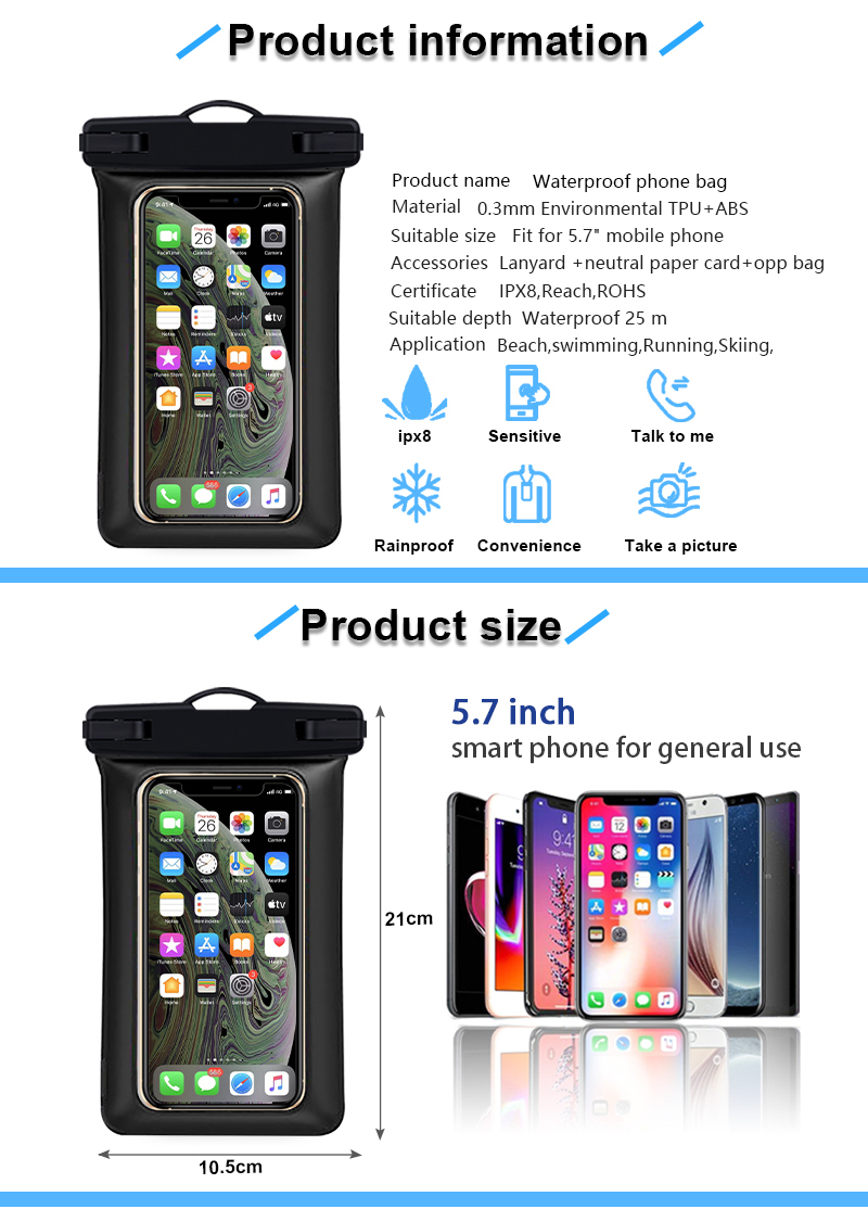 Zone - IPX8 univerzalna mobilna PVC torbica neraskidiva plutajuća vodootporna torba za mobitel u usporedbi sa sličnim proizvodima na tržištu, ima neusporedive izvanredne prednosti u pogledu performansi, kvalitete, izgleda, itd., i uživa dobar ugled na tržištu. Zone sažima nedostatke prošlih proizvoda, te ih kontinuirano poboljšava. Specifikacije Zone - IPX8 univerzalne mobilne PVC torbice neraskidive plutajuće vodootporne torbe za mobitel mogu se prilagoditi prema vašim potrebama.