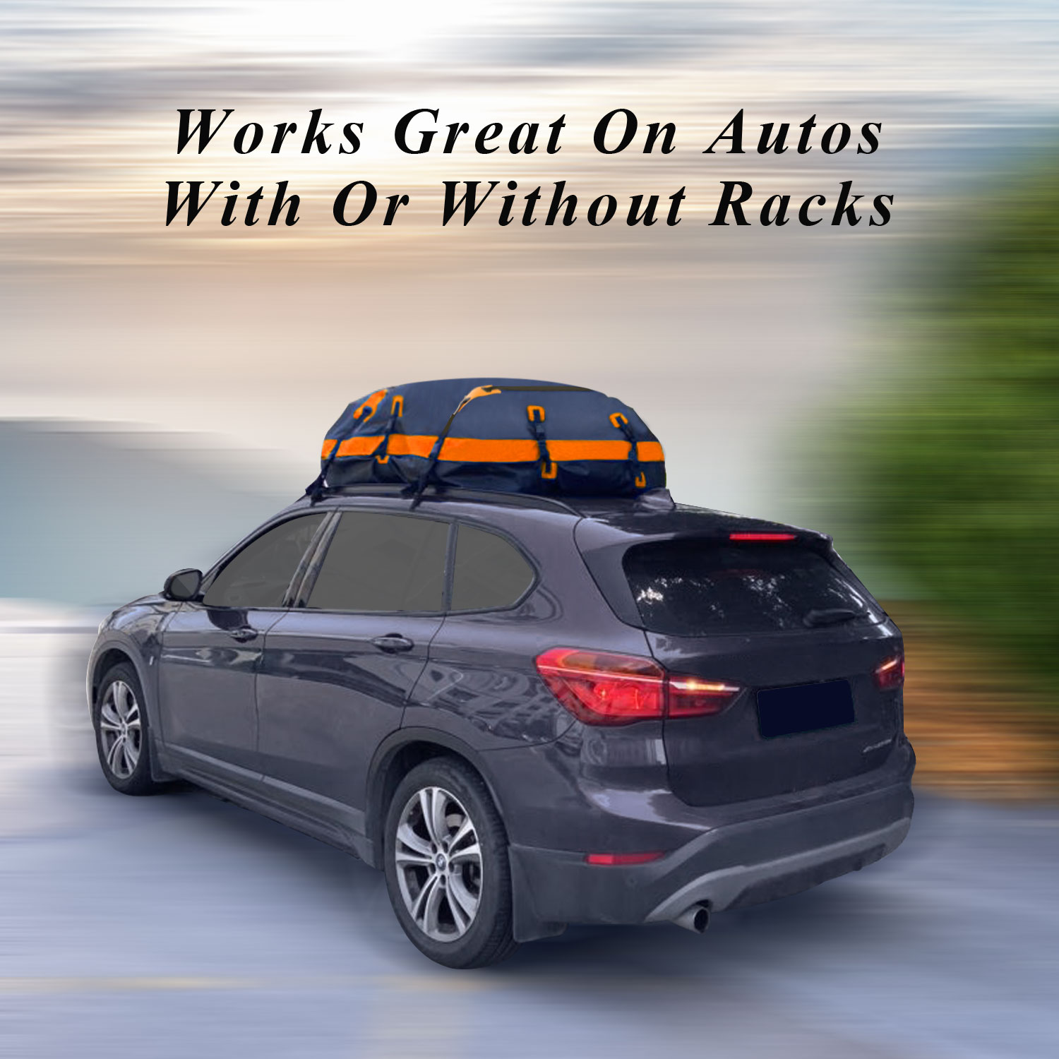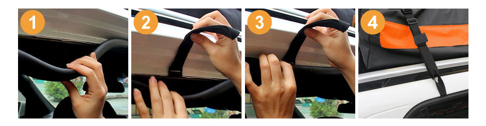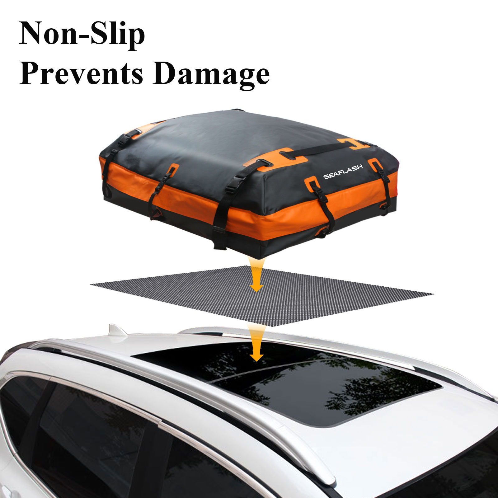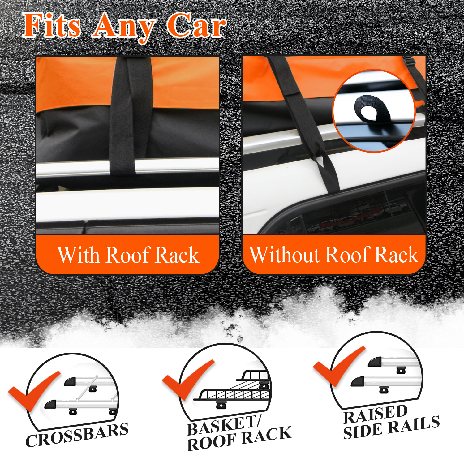 5.Tilpass alle biler: Enkelt raskt og enkelt å installere på få minutter, enten det er et stativ installert på bilen eller ikke. De 4 dørskrokene og de 4 sterke stroppene kan alltid sikre takbagasjen. Antisklimatten kan ikke bare fikse takposen, men også beskytte taket ditt mot riper og skader.