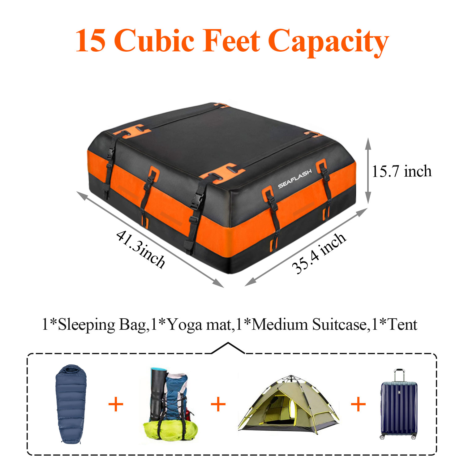 1. Komfortabel reise: CARGO ROOF lastebærere for kjøretøy har en stor plass på 15 kubikkfot, total størrelse er L41,3" xW35,4" xH15,7". Kan enkelt holde 2-4-reise bagasjekofferter, telt, soveposer og mer Øk lasterommet på kjøretøyet, gjør reisen din ikke lenger overfylt.