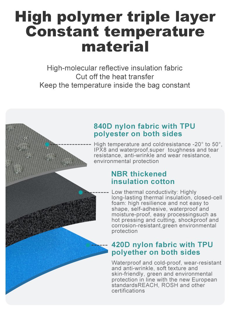 | Material | eco-friendly 840DTPU+Thermal cotton (EU and Japanese standard) |