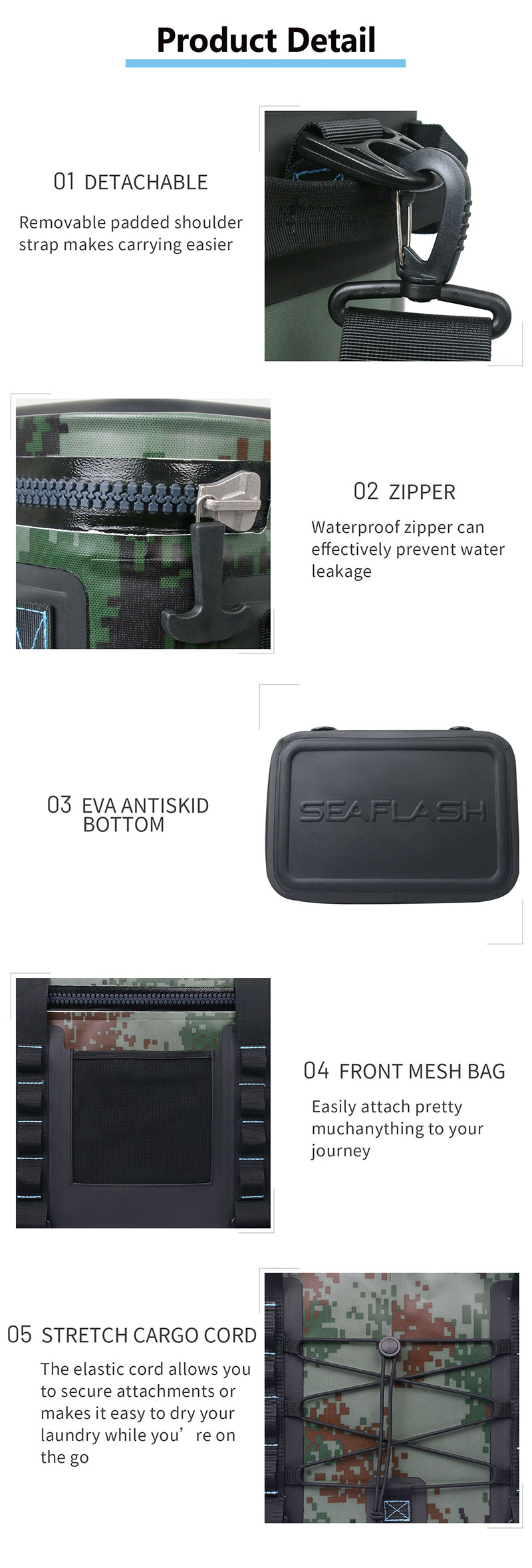 2.Special Details :military grade high-end customized material, scratch resistant and wear resistant, suitable for outdoor expansion activities.The back elastic cord can be used to stow wet clothes, sandals, etc. The front mesh pockets on two sides for keys, wallet, or a cell phone. The plated steel anchor shaped zipper pull is easy on the fingers and is built for the long haul.2pcs zipper lubricant, and user manual.