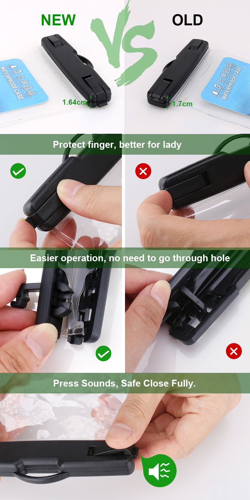 6.Durable adjustable lanyard included - carry your phone case around your neck or body for easy access. Simple to use snap and lock mechanism allows you easy access to your bag's content. Please remember to use your phone volume control buttons to take pictures or a video under the water surface as the screen will be less responsive