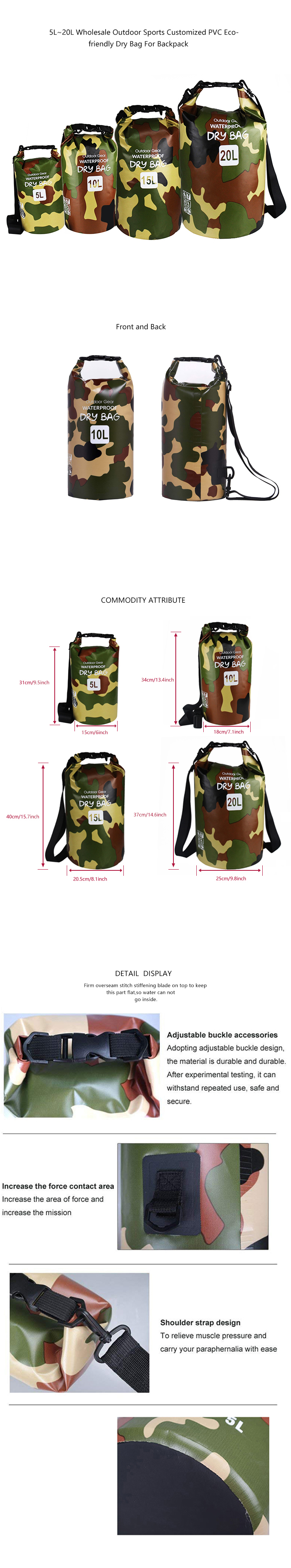 At Shenzhen Zone Sport Products Co., Ltd, the efforts of all our employees have resulted in the steady improvement of our R&D capabilities and the launch of Green Camo Waterproof Travel Bag For Kayaking, Camping, Boating 5L 10L 15L 20L Waterproof Dry Bags It caters to the foreign markets. Our capable staff has been devoted to the improvement and upgrades of technology.In the Other Camping & Hiking Products,the product is widely used.