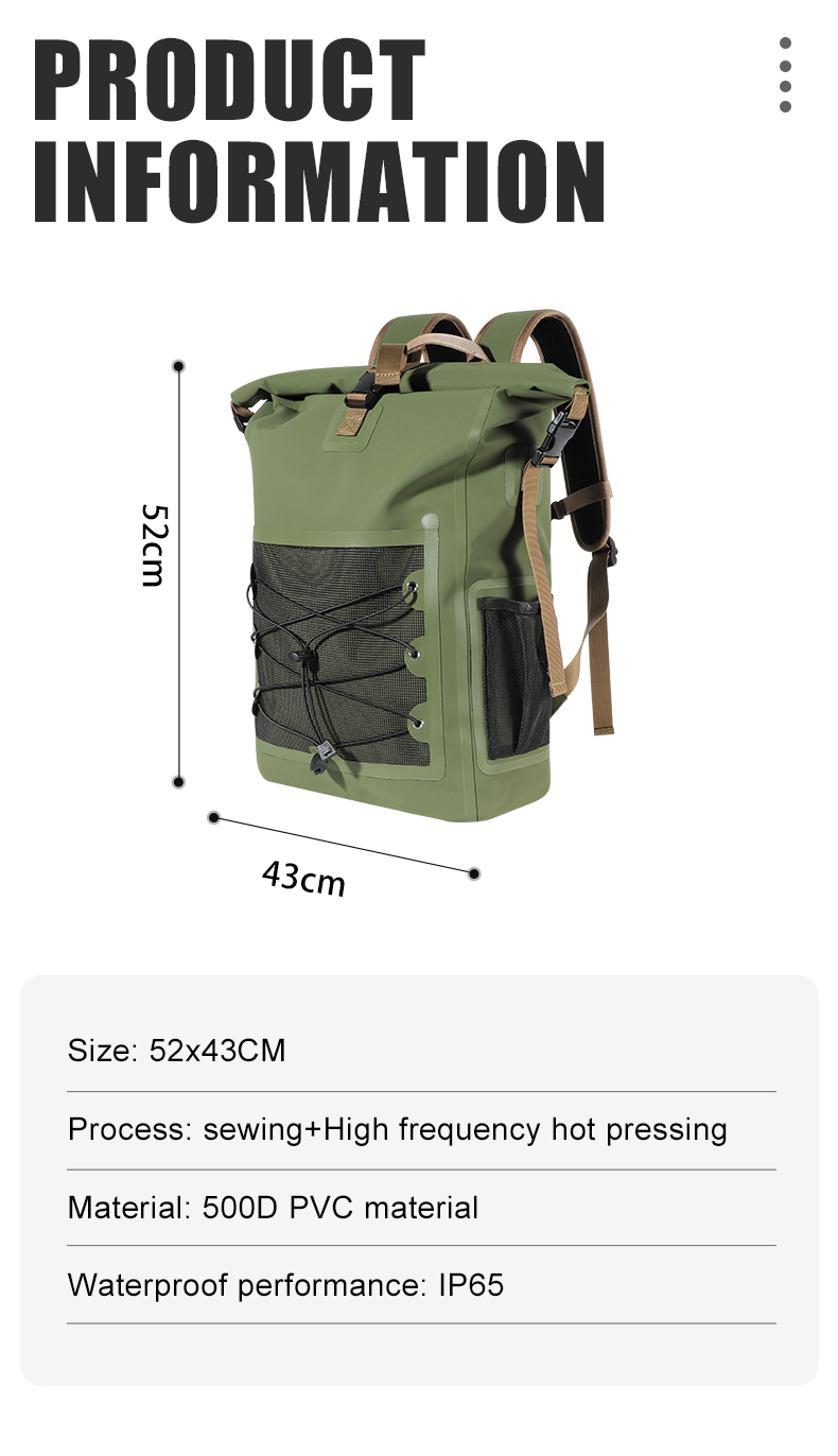 Built tough with high-quality 500D PVC fabric, this PVC waterproof backpack boasts an IP65 waterproof rating – your reliable shield against heavy rain, splashes, and spills. Experience true wet and dry use versatility, confident your essentials (and your tech) stay perfectly dry inside.