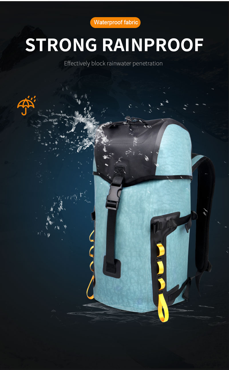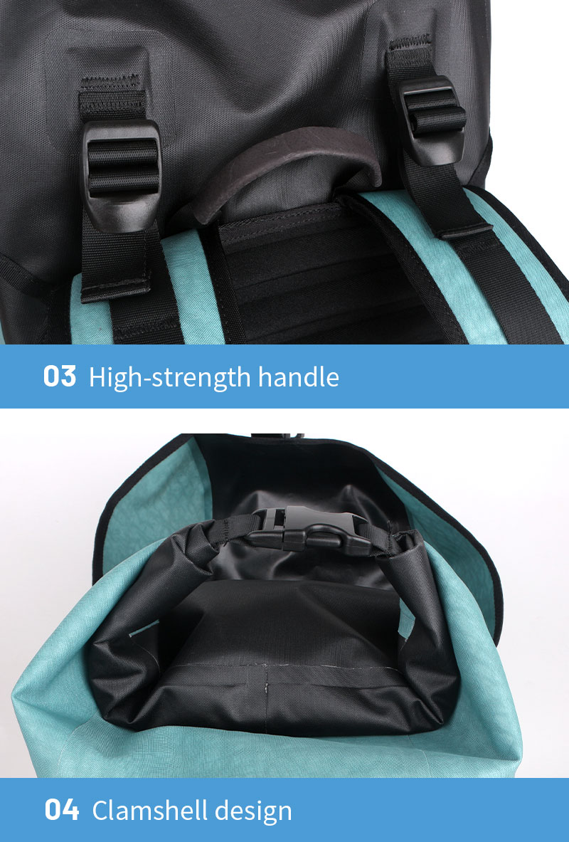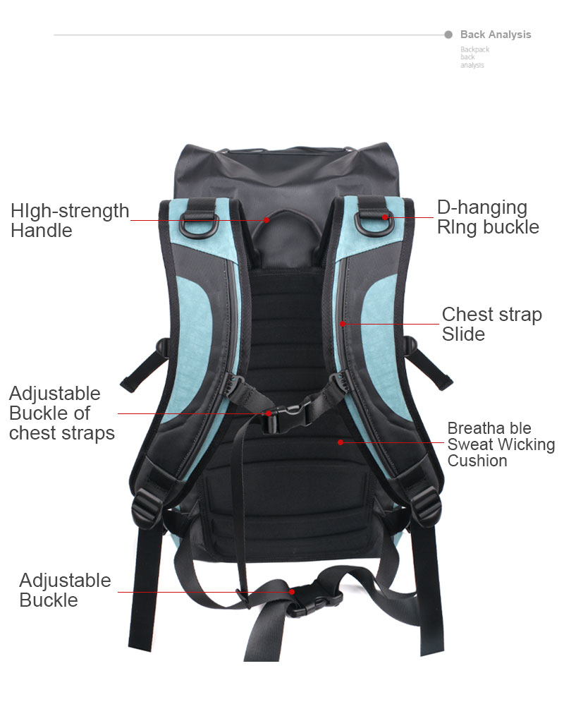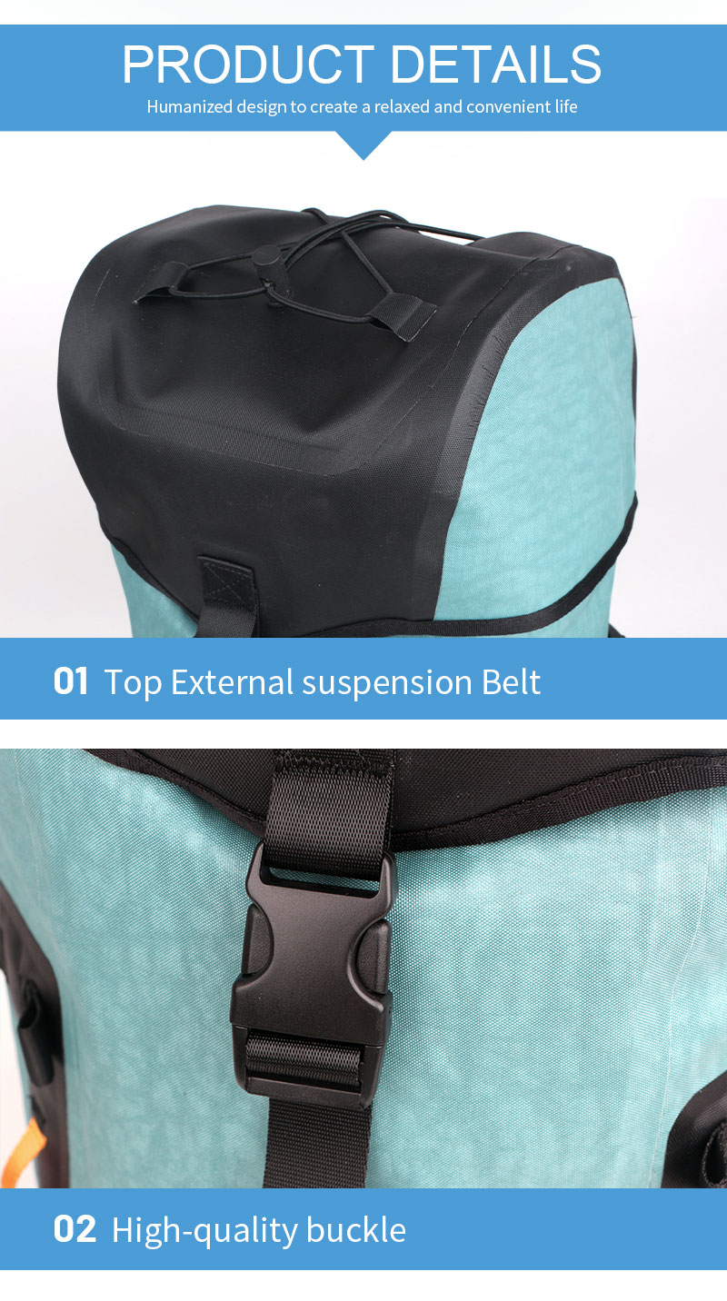 2. Cinto de suspensão externo superior, compartimento principal impermeável do corpo principal do roll-top generoso; Protege o conteúdo de poeira, areia, sujeira e água, design de fivela externa, proteção dupla