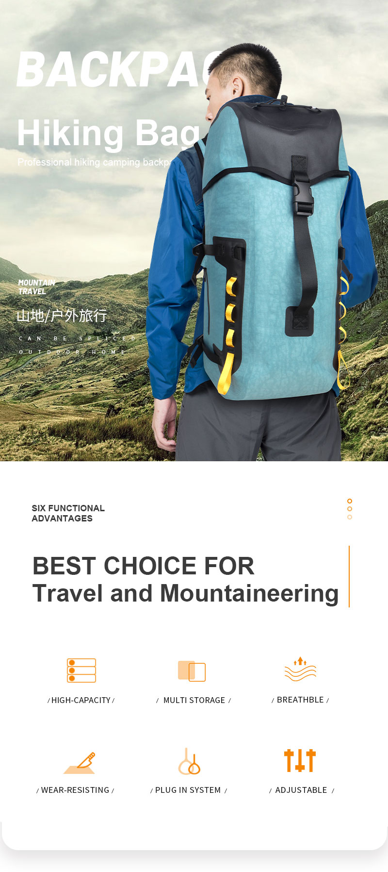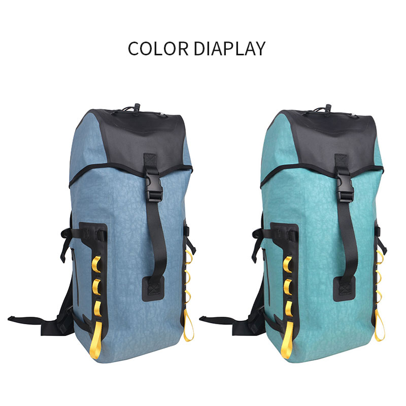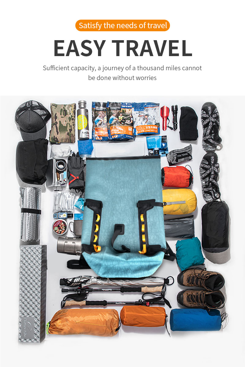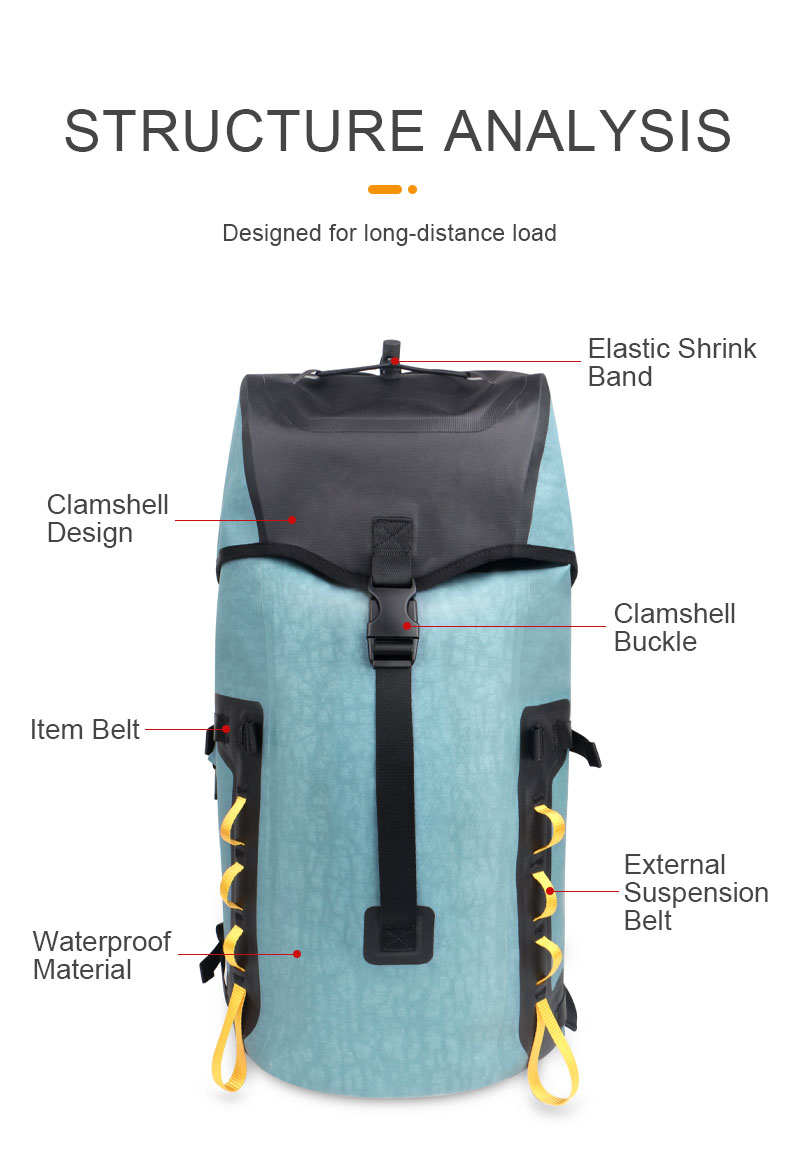 2. Cinto de suspensão externo superior, compartimento principal impermeável do corpo principal do roll-top generoso; Protege o conteúdo de poeira, areia, sujeira e água, design de fivela externa, proteção dupla