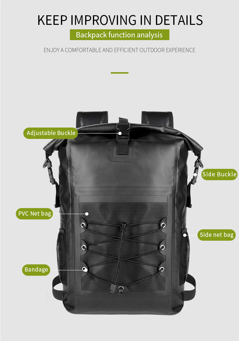 | Umsebenzi | Ibhegi engangeni manzi yeCamping yokuqubha, iibhegi zaselwandle zokuloba, ibhegi engenamanzi yokukhempisha, Yomelele, ikhephu, ibhegi engangeni manzi kwimisebenzi yangaphandle. |